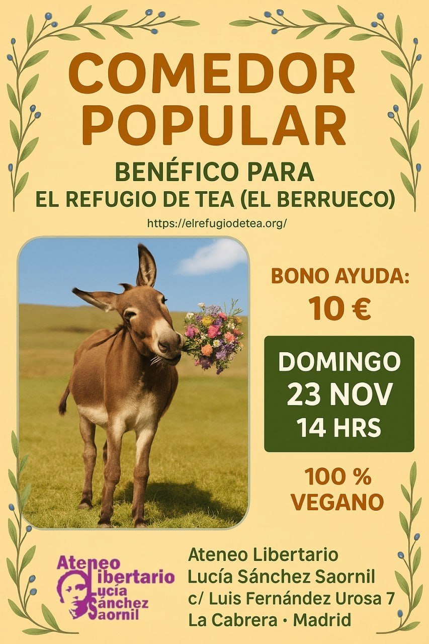El Ateneo Libertario Lucía Sánchez Saornil organiza un comedor popular 100% vegano con un objetivo muy especial: recaudar fondos para El Refugio de Tea, un proyecto ubicado en El Berrueco que dedica todos sus esfuerzos al rescate, cuidado y protección de animales que han sufrido abandono, maltrato o situaciones de riesgo. Su labor diaria es un ejemplo de compromiso, sensibilidad y defensa de la vida, y queremos aportar nuestro granito de arena para que puedan seguir adelante.
